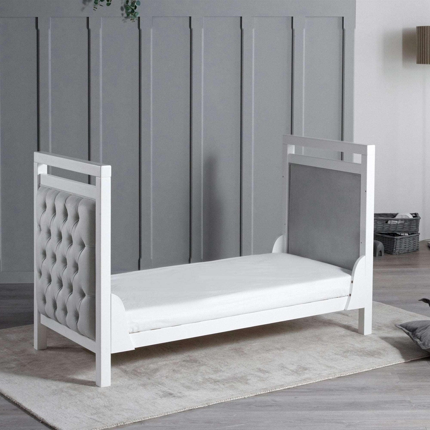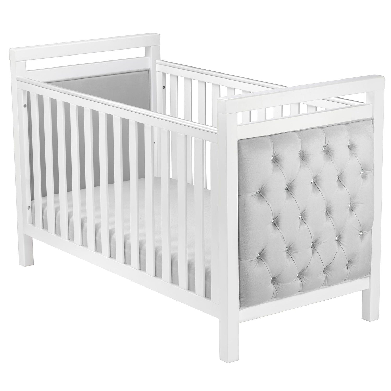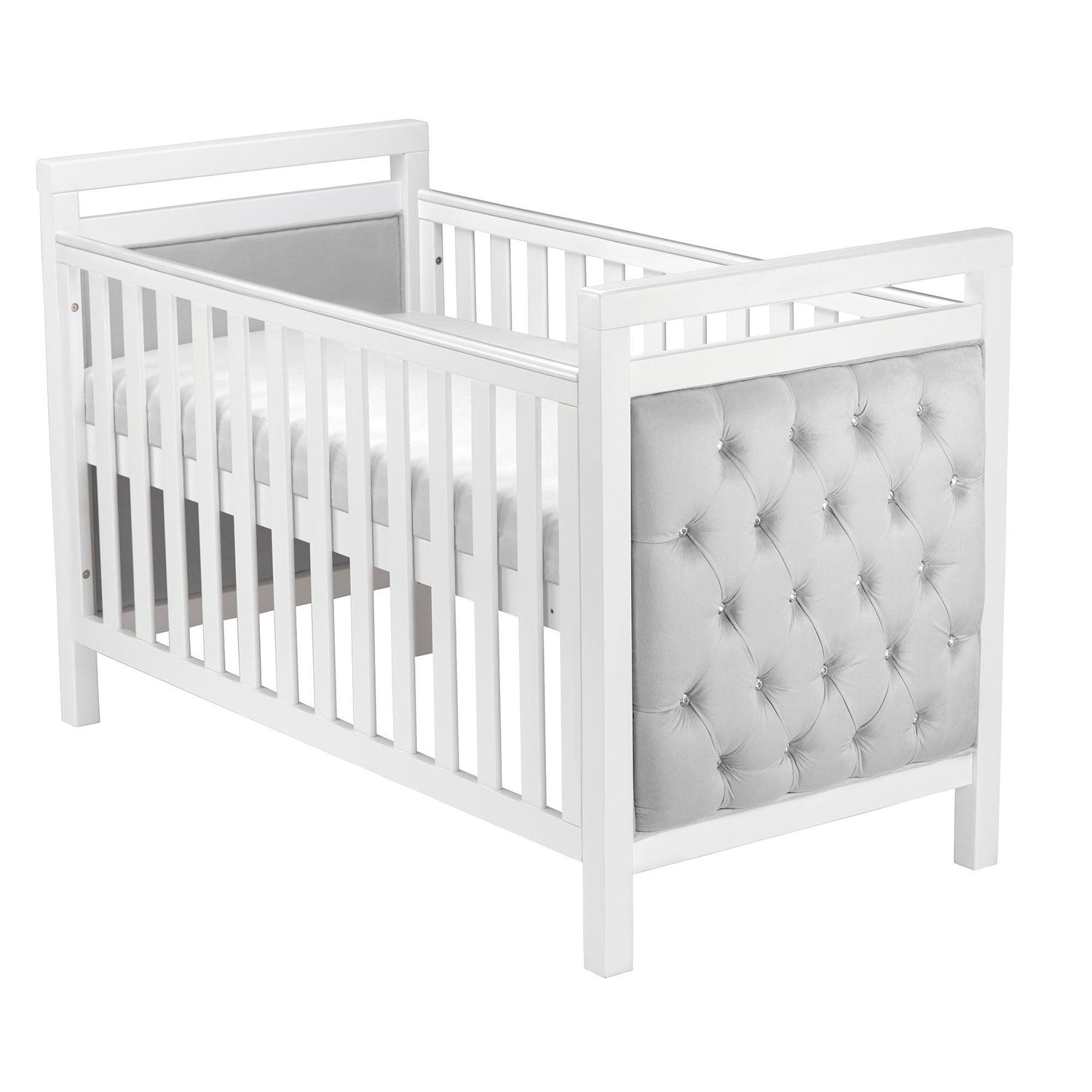 The Babymore Velvet Deluxe Cot Bed oozes Class and luxury! A luxurious soft touch velvet fabric and timeless white finish plus a diamante tufted upholstery makes this cot bed a statement piece. This beautiful and distinctive model will fit effortlessly into any surrounding. Water resistance fabric with wipe clean for easy maintenance. Made using generous 5cm thickness of solid wood structure ensure it's robust and will last for years.