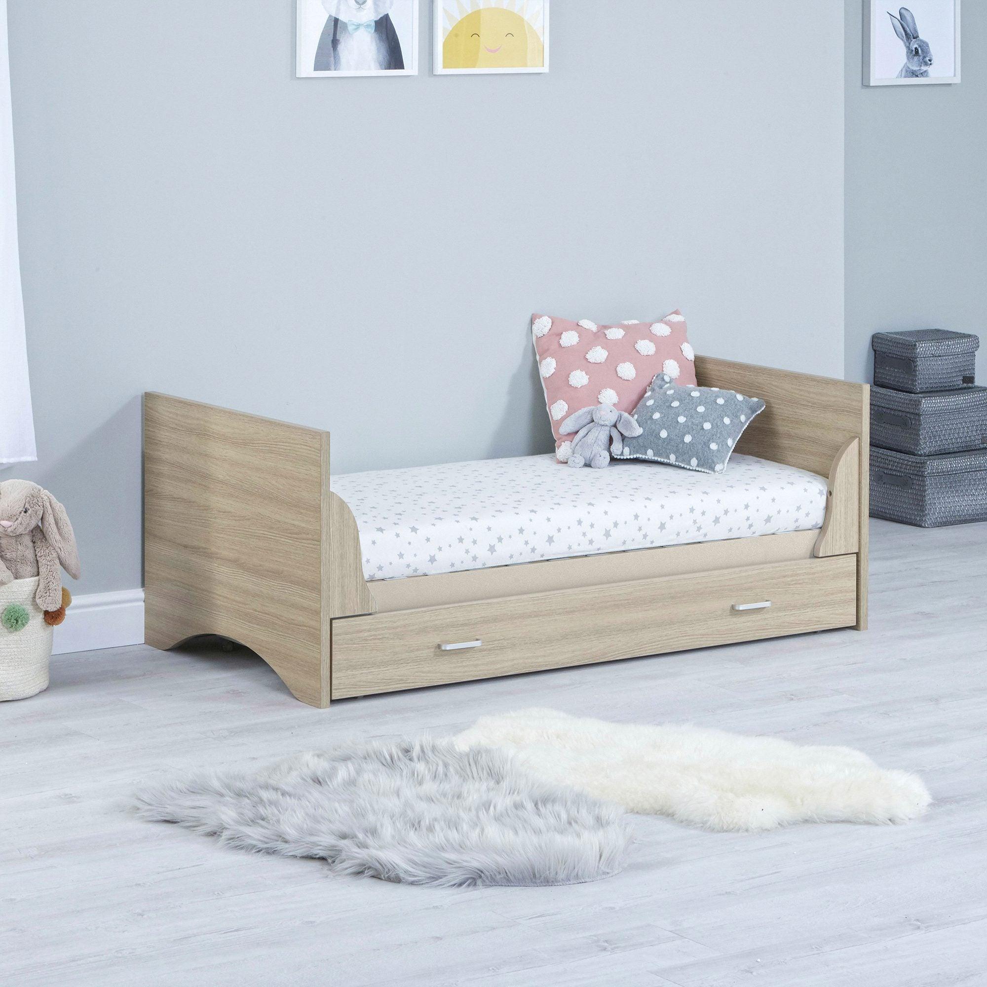 Babymore Veni cot beds With Drawer offers a modern, warm, and clean design, with its neat lines and a beautifully textured Warm Oak wood effect finish. It will sit stylishly in your baby’s nursery.