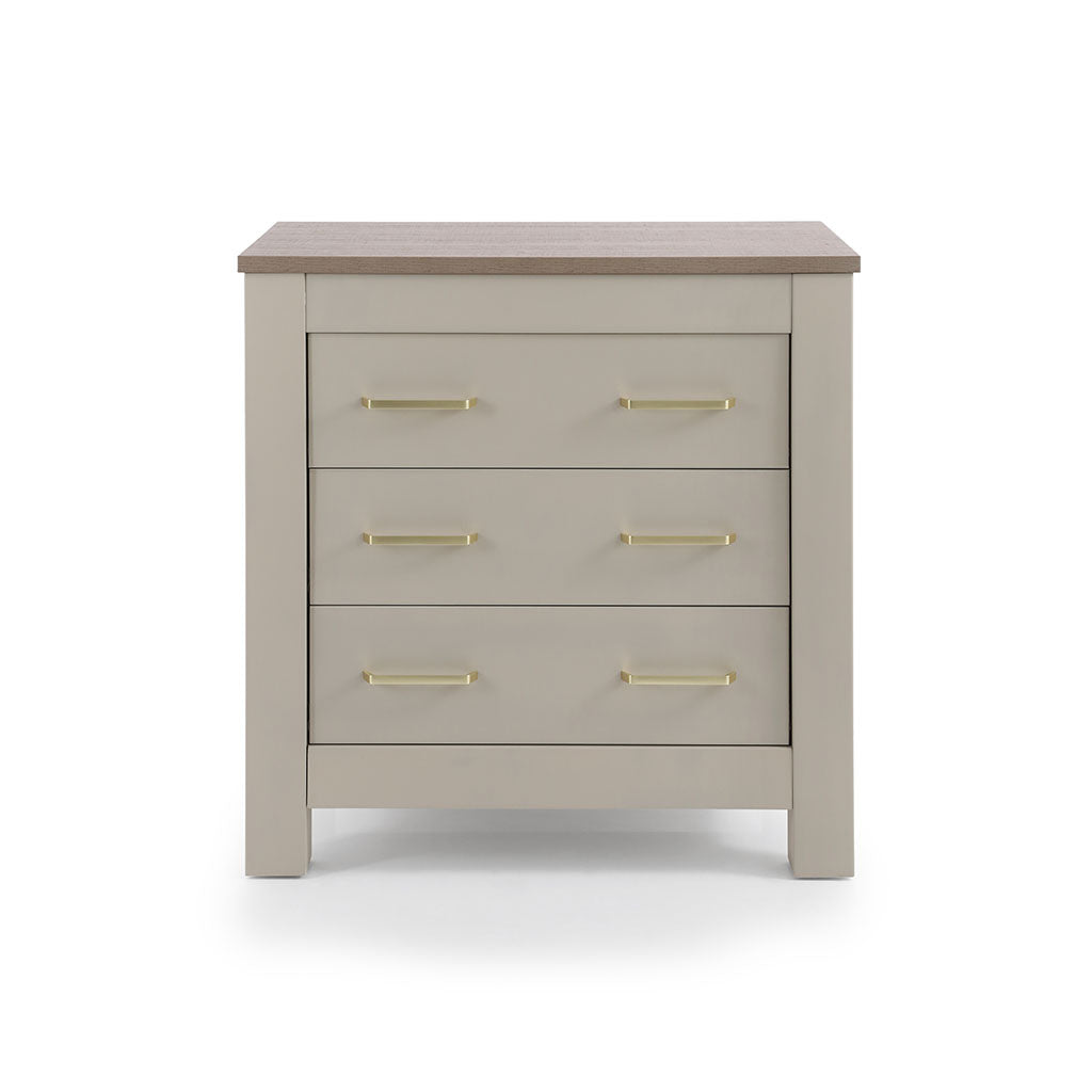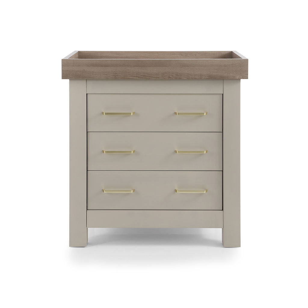 Completing the set, the dresser with a removable baby changer includes three spacious drawers.