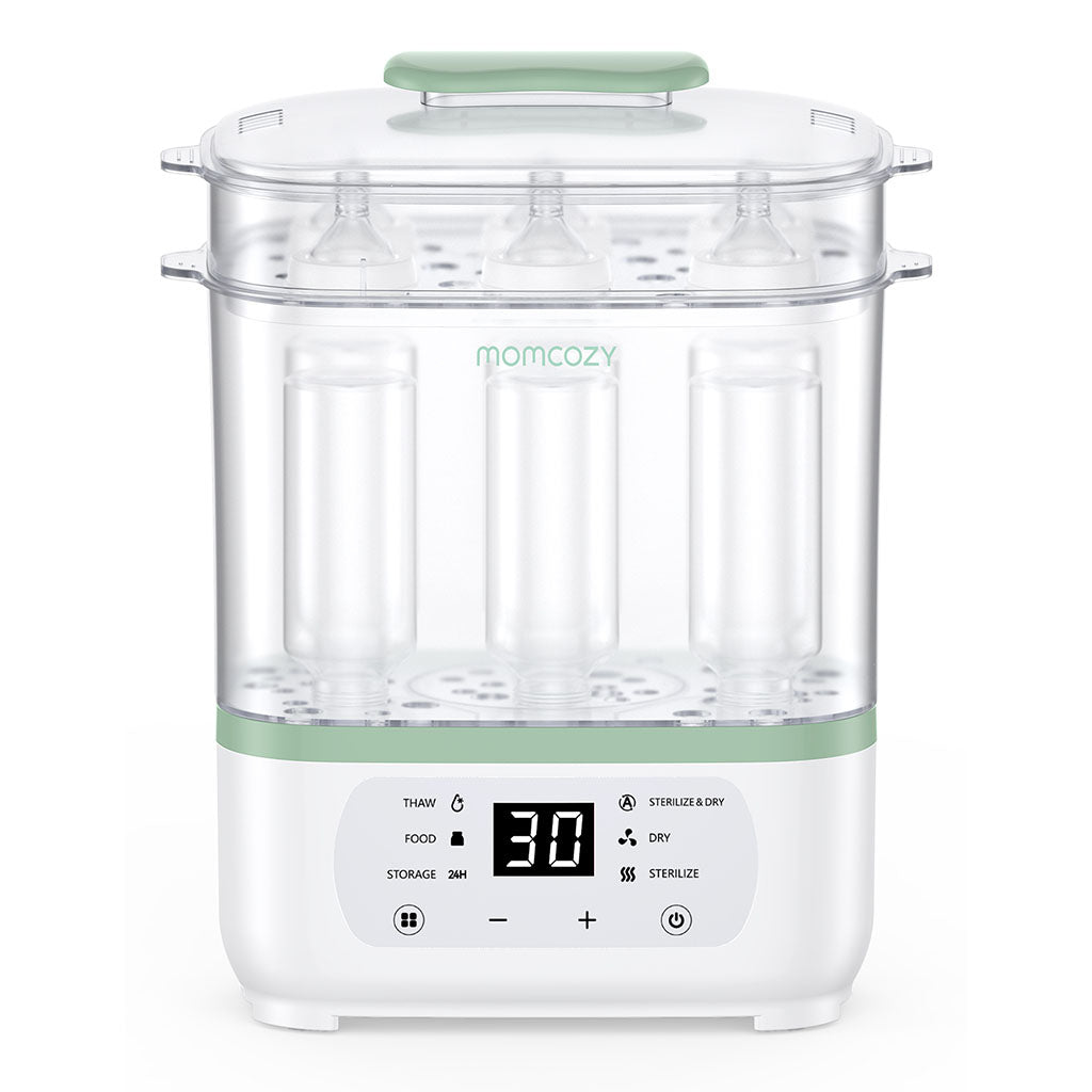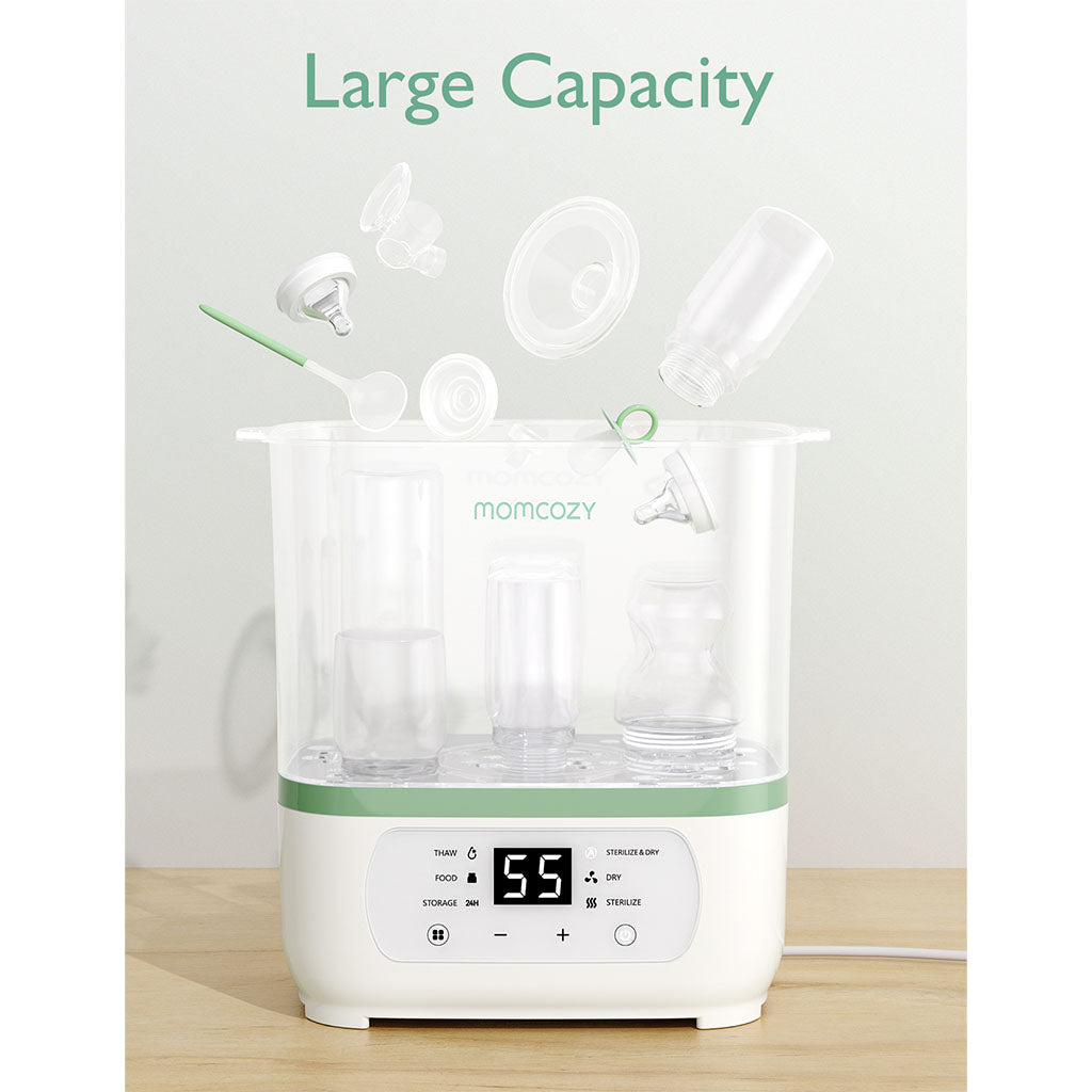 The Momcozy bottle steriliser is an 8-in-1 multi-function device that allows you to sterilise, dry, thaw, and prepare baby food. With a 24-hour secure storage function and the capacity to hold 8 baby bottles, it provides convenience for busy parents.