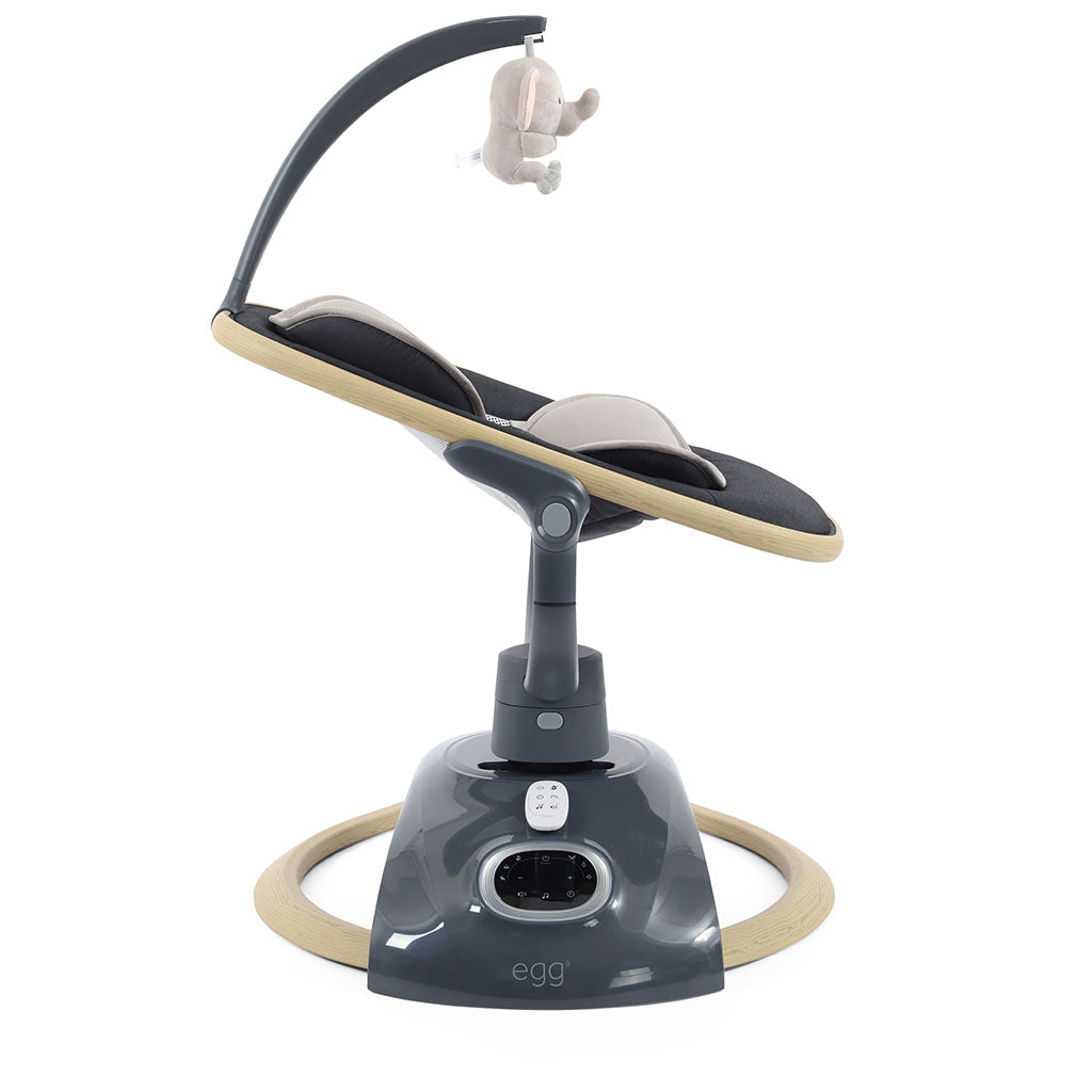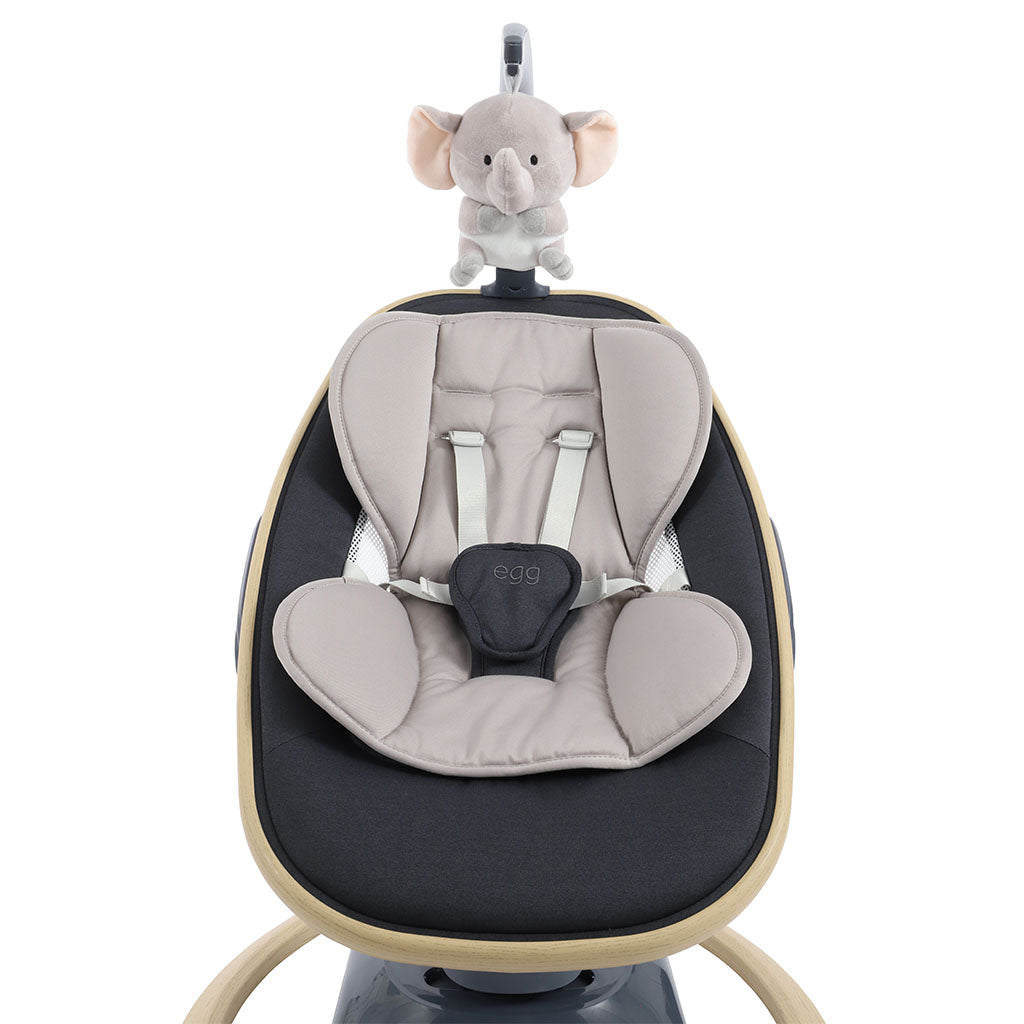 Adjustable recline, touchscreen controls, remote operation, and a 5-point safety harness offer ease and peace of mind. Finished in ultra-soft fabrics with a cosy newborn insert, it also features an overhead toy bar with a charming Elephant toy.