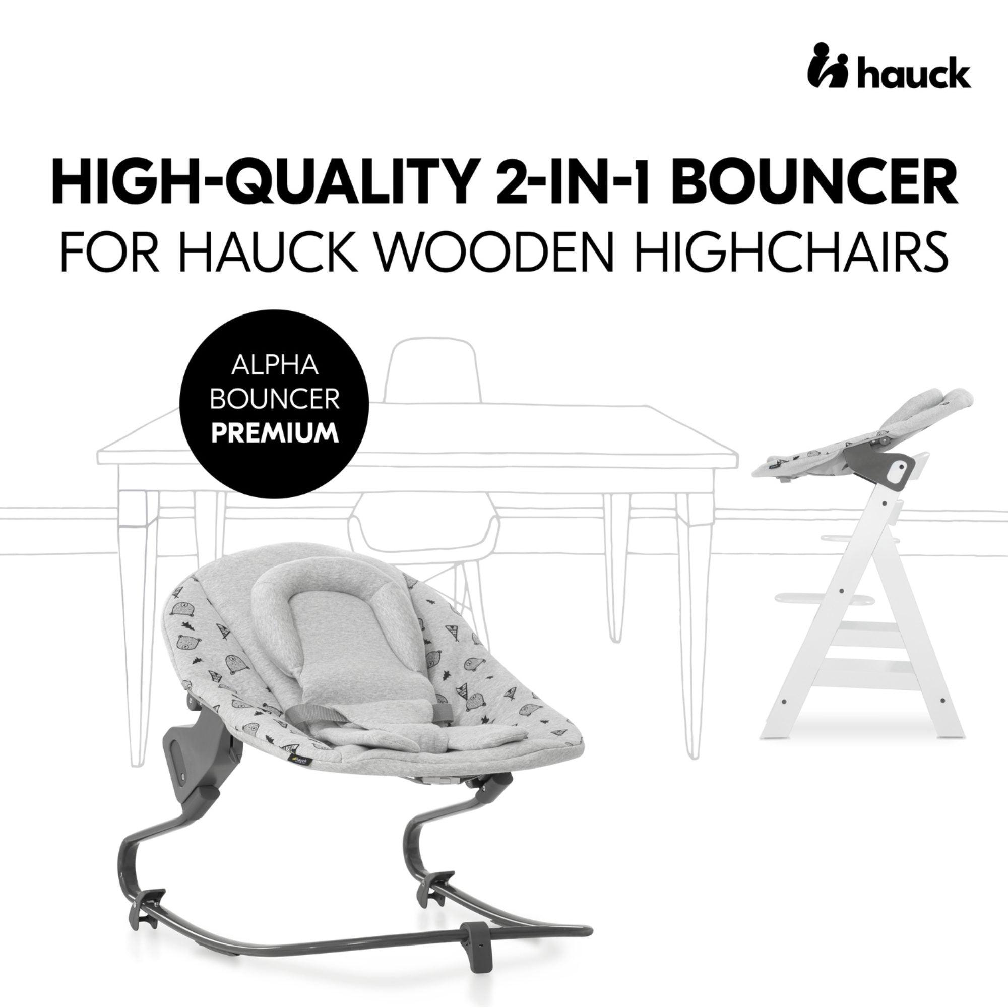 The Alpha Bouncer Premium, designed for Hauck wooden highchairs, is a high-end 2-in-1 bouncer.