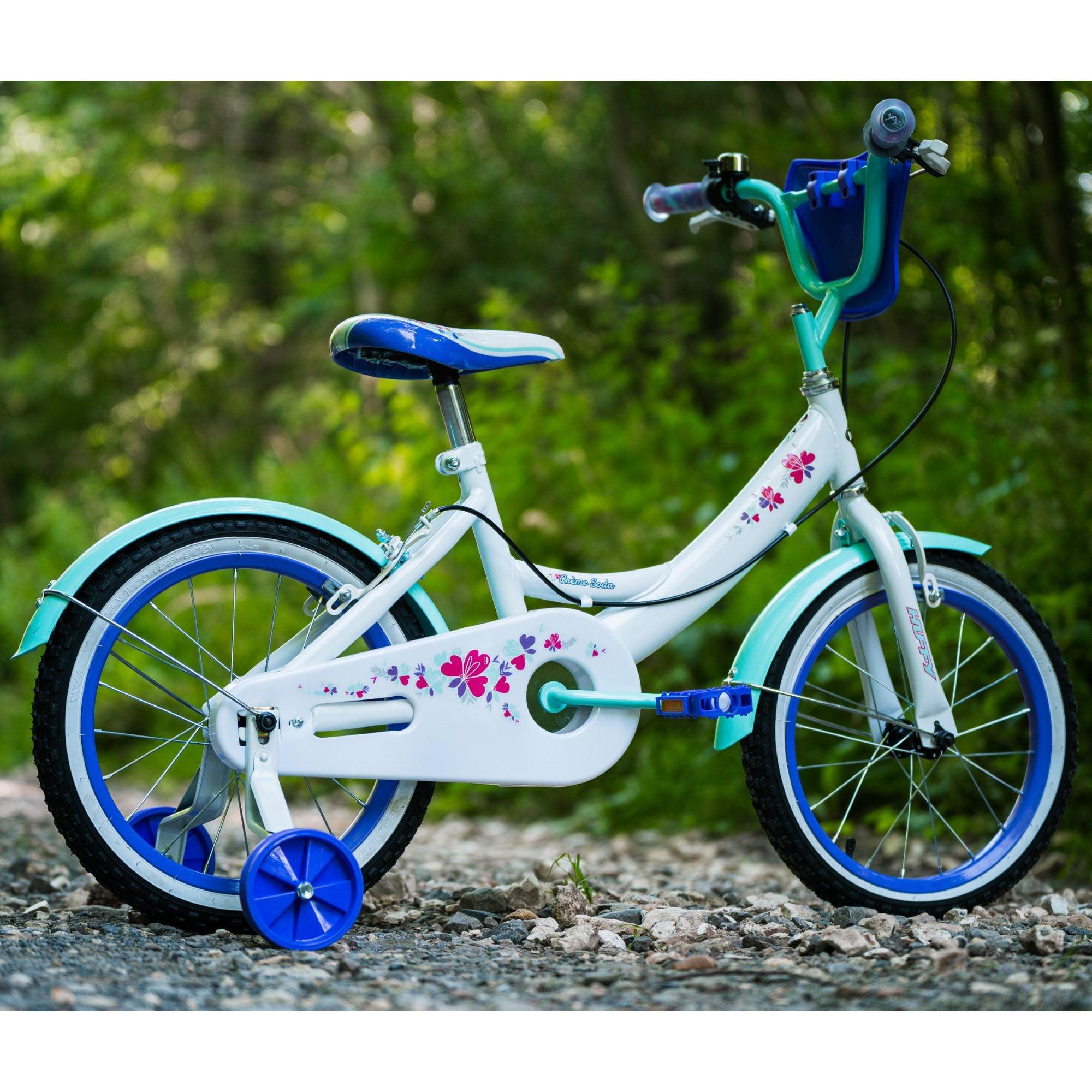 Huffy Crème Soda 16" Girls Bike is fun and stylish with flower graphics and sea crystal mud guards for a look that stands out from the crowd. The designers crafted the front handlebar pad for safety while coordinating the timeless style. They decorated the seat to match the look, ensuring a comfortable ride with padding.This single speed bike with stabilisers is easy to ride. This bike has front and rear brakes and wide stabilisers for sturdy pavement use.