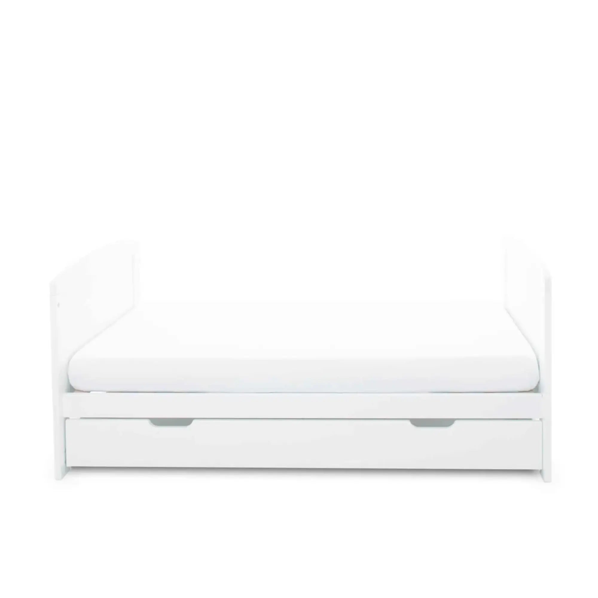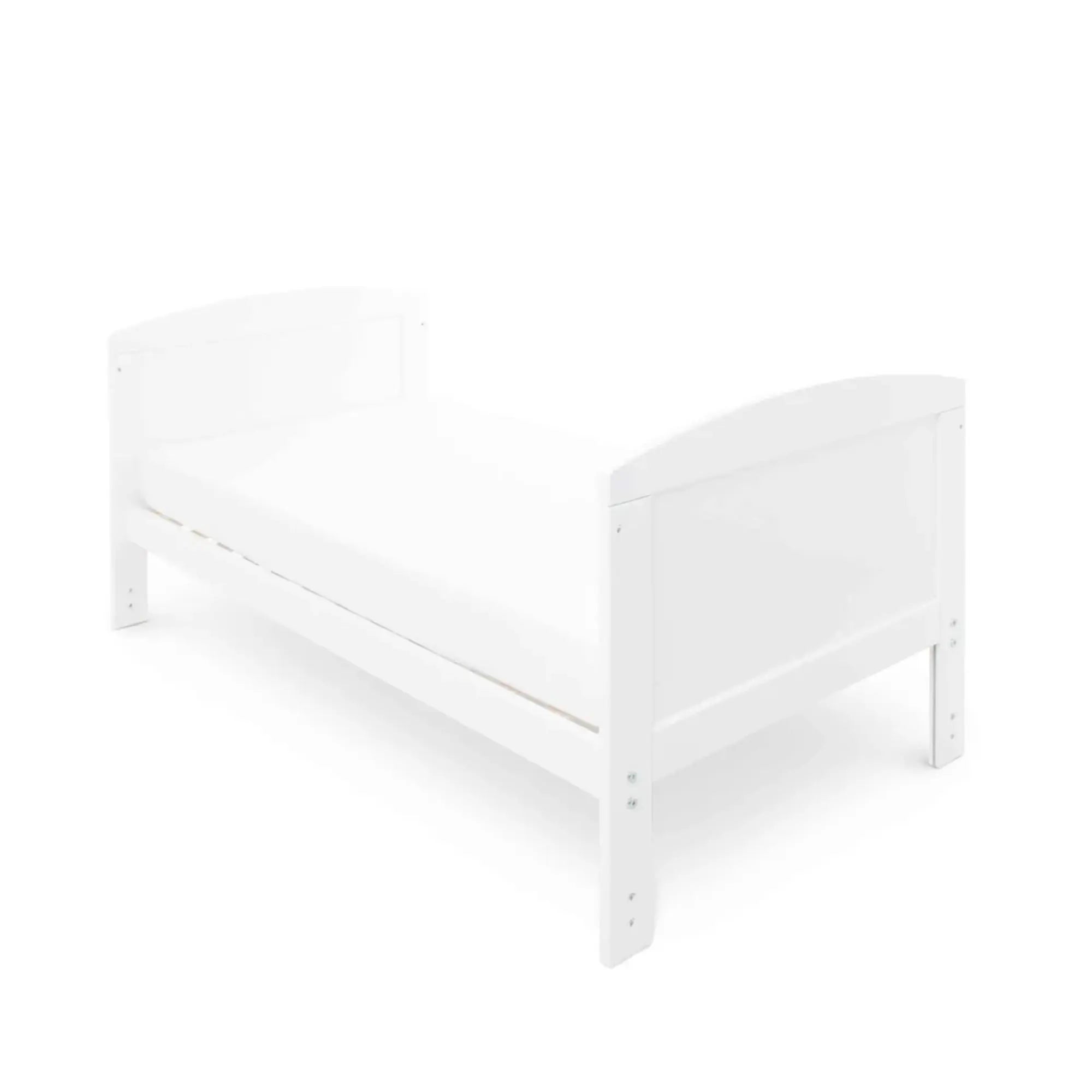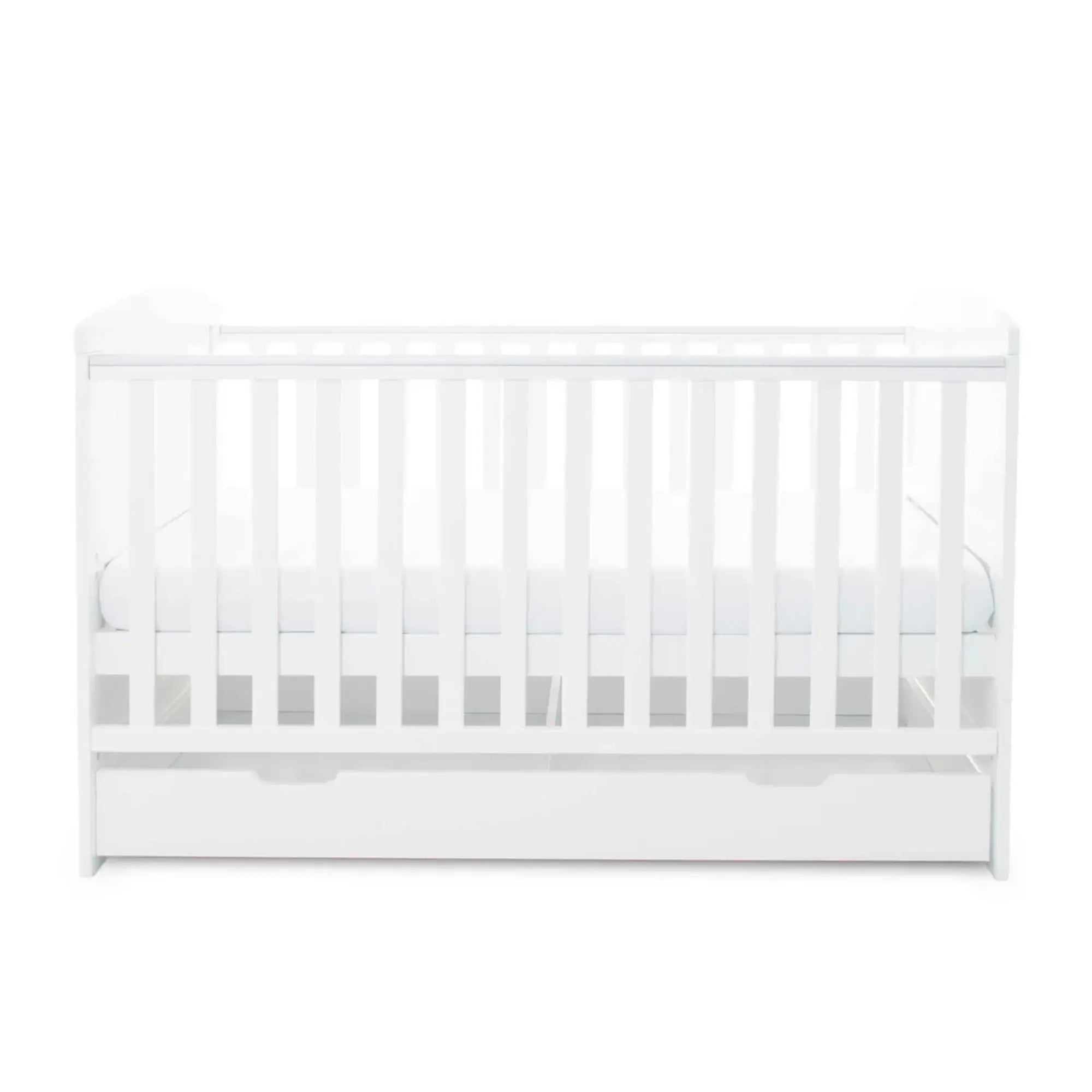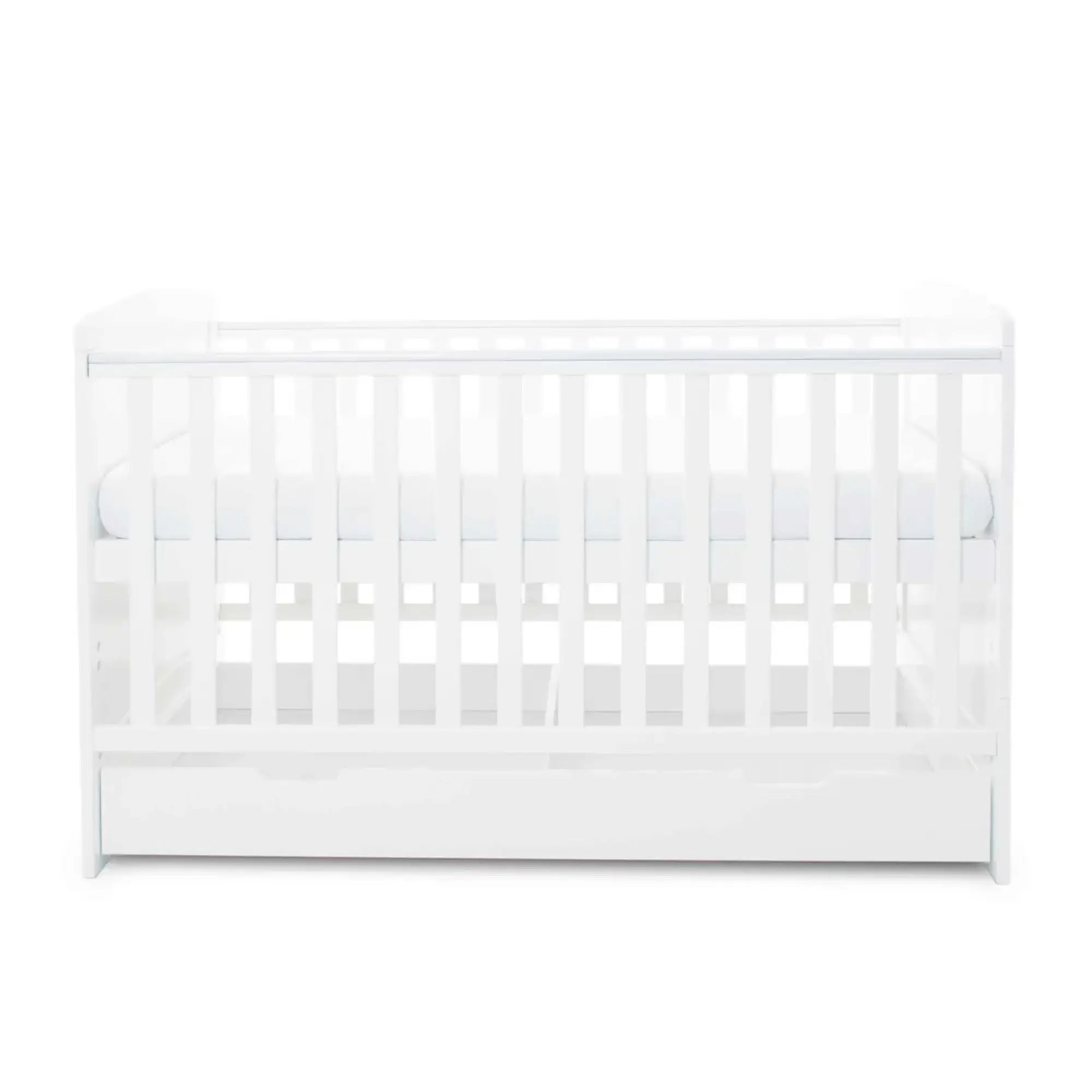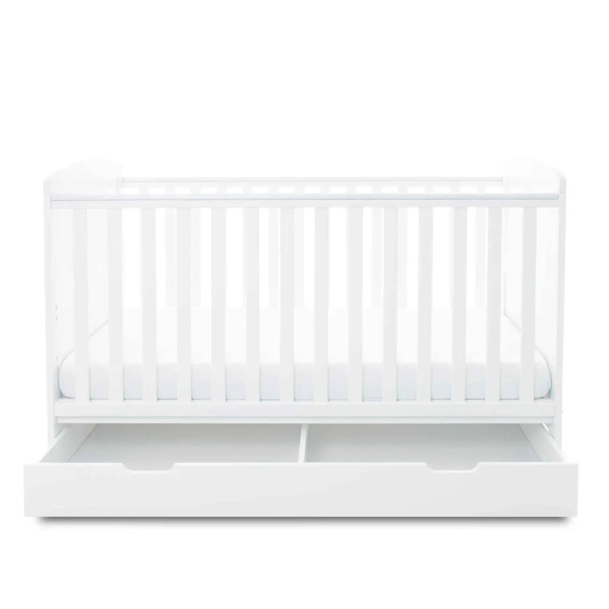 The Coleby cot bed is it the perfect solution for parents searching for a stylish and practical piece to furnish little one's first room. It's traditional design has some great key features, and the included under drawer also offers a handy storage solution to keep little one's essentials close at hand. The cot bed has open slatted sides that are perfect for watching over your baby during their most peaceful times, and the presence of teething rails ensures your child's delicate teeth are protected. The top position of the mattress base allows your baby to be taken in and out of the cot bed without any unnecessary bending, from birth to approximately 6 months. Whilst they're learning to sit and stand, the mattress base can then be lowered by a further two positions, providing extra security and reassurance. Once your little one is ready to progress to a bed, the Coleby cot bed can then convert seamlessly into a stylish junior bed, suitable for a child up to approximately four years old. The added under drawer is on castors to offer a greater depth, perfectly matches the cot bed and seamlessly fits underneath keeping everything neat and tidy. Our Coleby cot bed is the perfect choice from tot to toddler, offering maximum durability and great value.