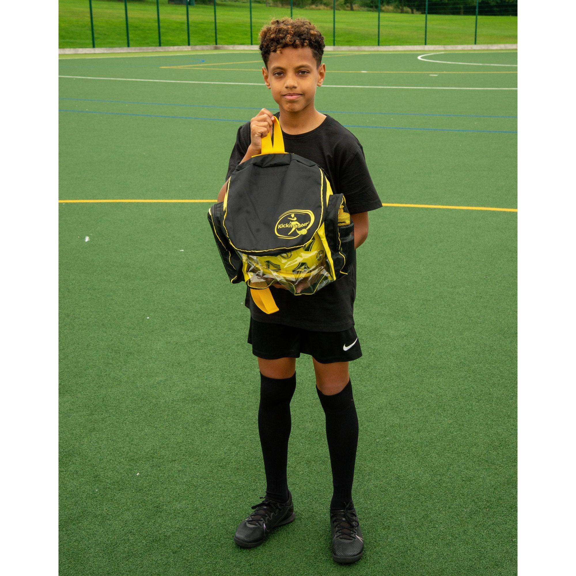 Get all set for your football training with this Kickmaster Academy Backpack Training Set. The printed zip-top backpack contains a durable size four training ball (official size), printed shin pads, four flexi training cones and printed drinks bottle to carry water or your favourite energy drink. The bag has breathable side pockets, that let you keep a bottle or other essentials handy. The shin pads come with a high-impact shell that helps to decrease the risk of injuries and you keep safe.