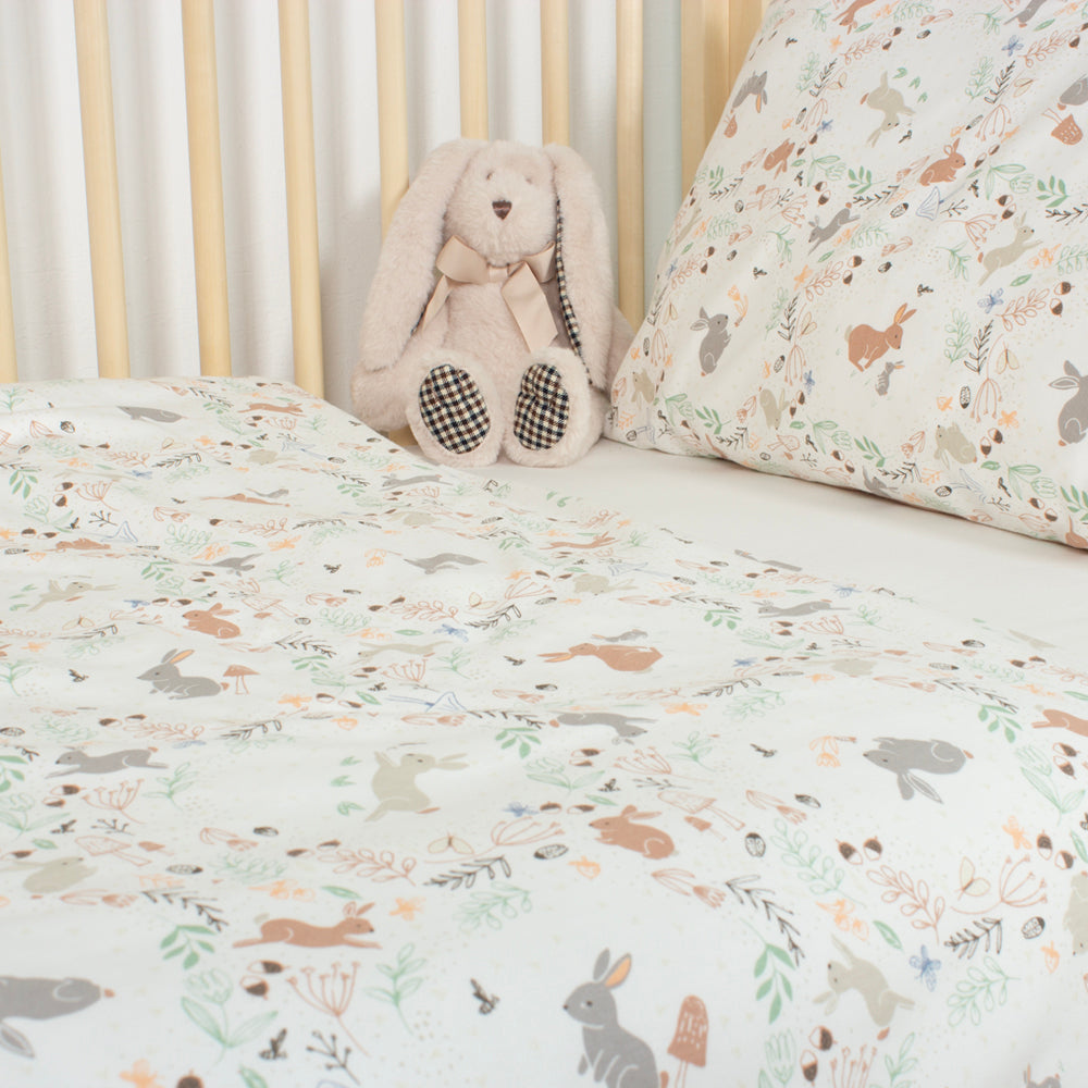 The cot bed duvet cover features two sides – a single block colour to one side and one of our beloved prints to the other. The dual-sided design adds a charming touch to any room.