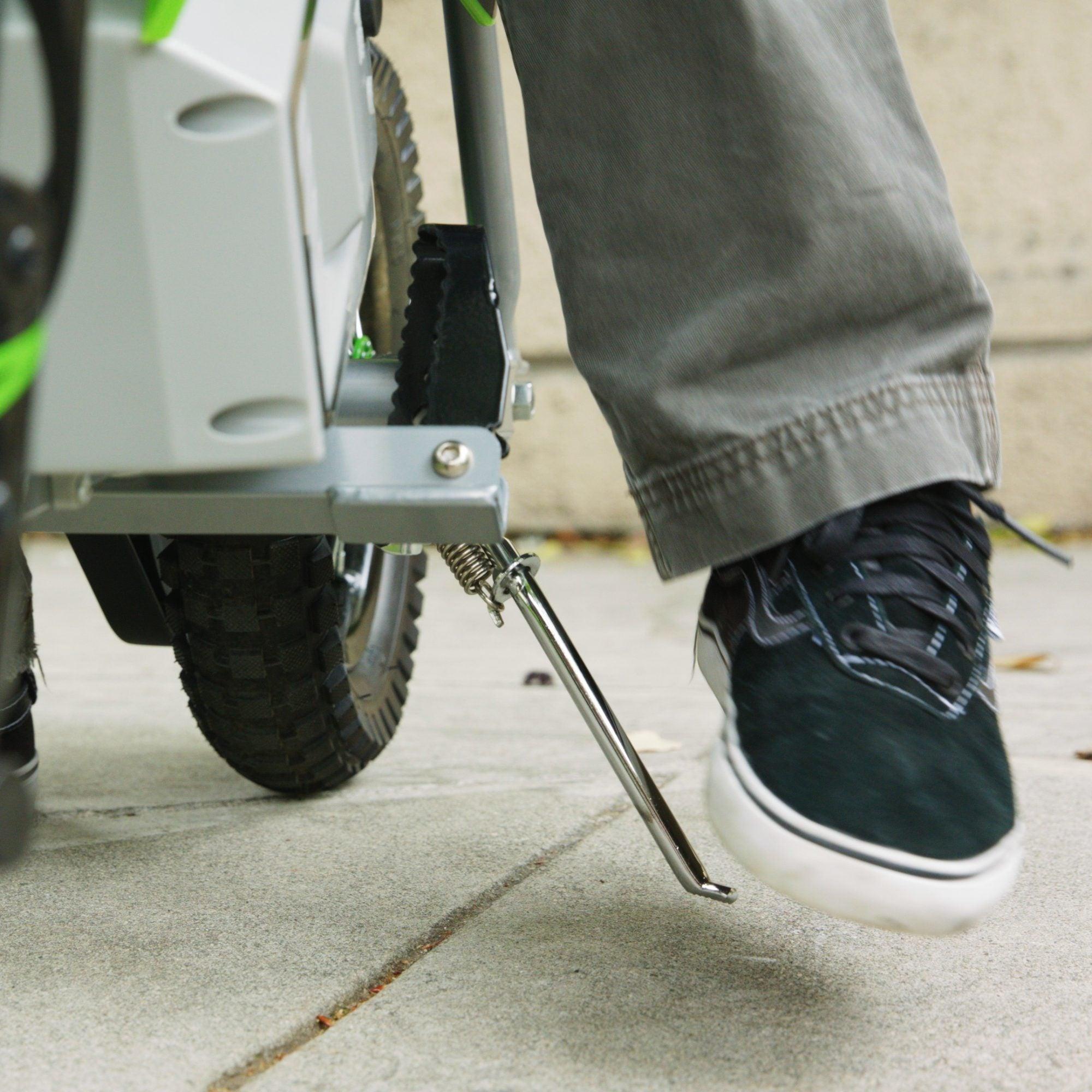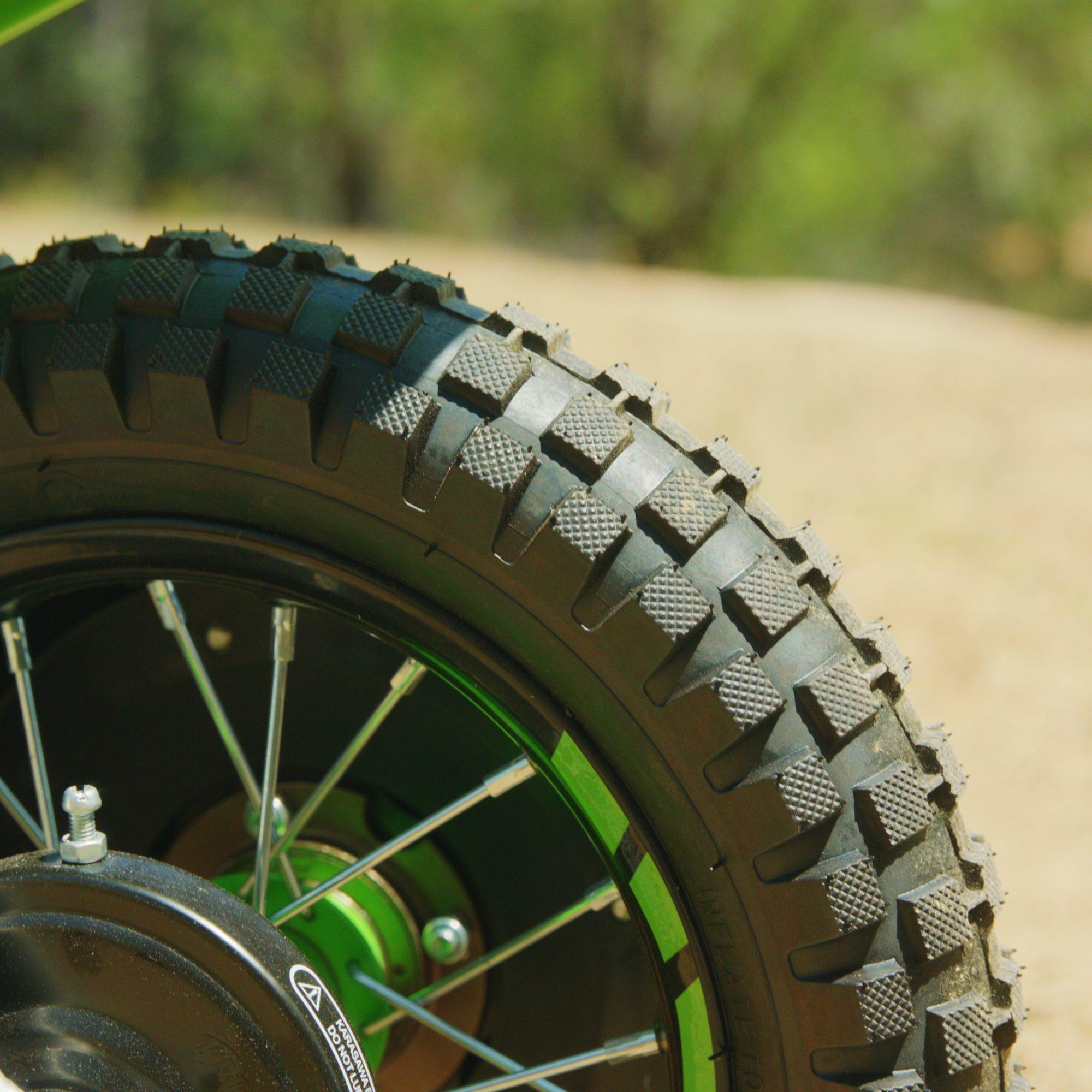The SX350 is a versatile, reliable bike suitable for riders aged 13+ weighing up to 140 lb (64 kg). The 12" pneumatic knobby tires with spoked wheels can handle any type of terrain, from soft dirt to muddy conditions, providing maximum support and performance for an effortless trail ride. The bike also features a retractable kickstand and folding metal foot pegs for added convenience and versatility.