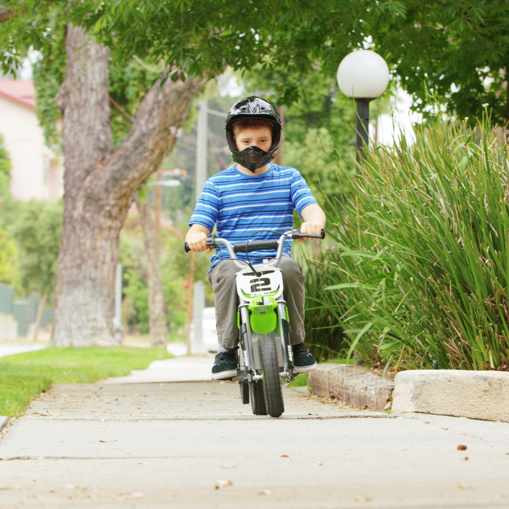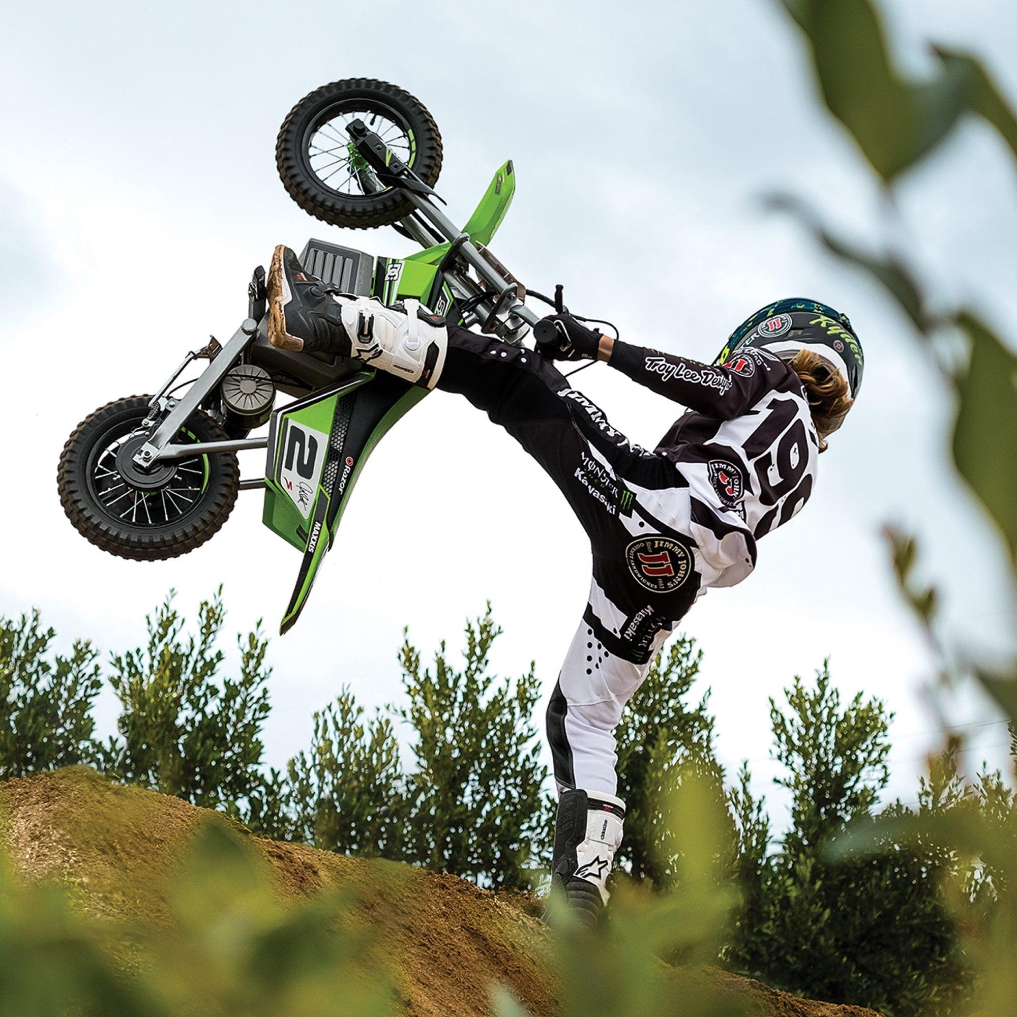 The Razor Dirt Rocket SX350 McGrath 24V Bike is an ideal starter bike for young riders. This electric dirt bike is designed to resemble Jeremy McGrath's supercross racer, offering an authentic riding experience with MX-frame geometry and genuine graphics. The Dirt Rocket can reach speeds up to 14 mph (22 km/h) and last for up to 30 minutes on a single charge and features a high-torque chain-driven motor and 24V sealed lead-acid rechargeable battery system.