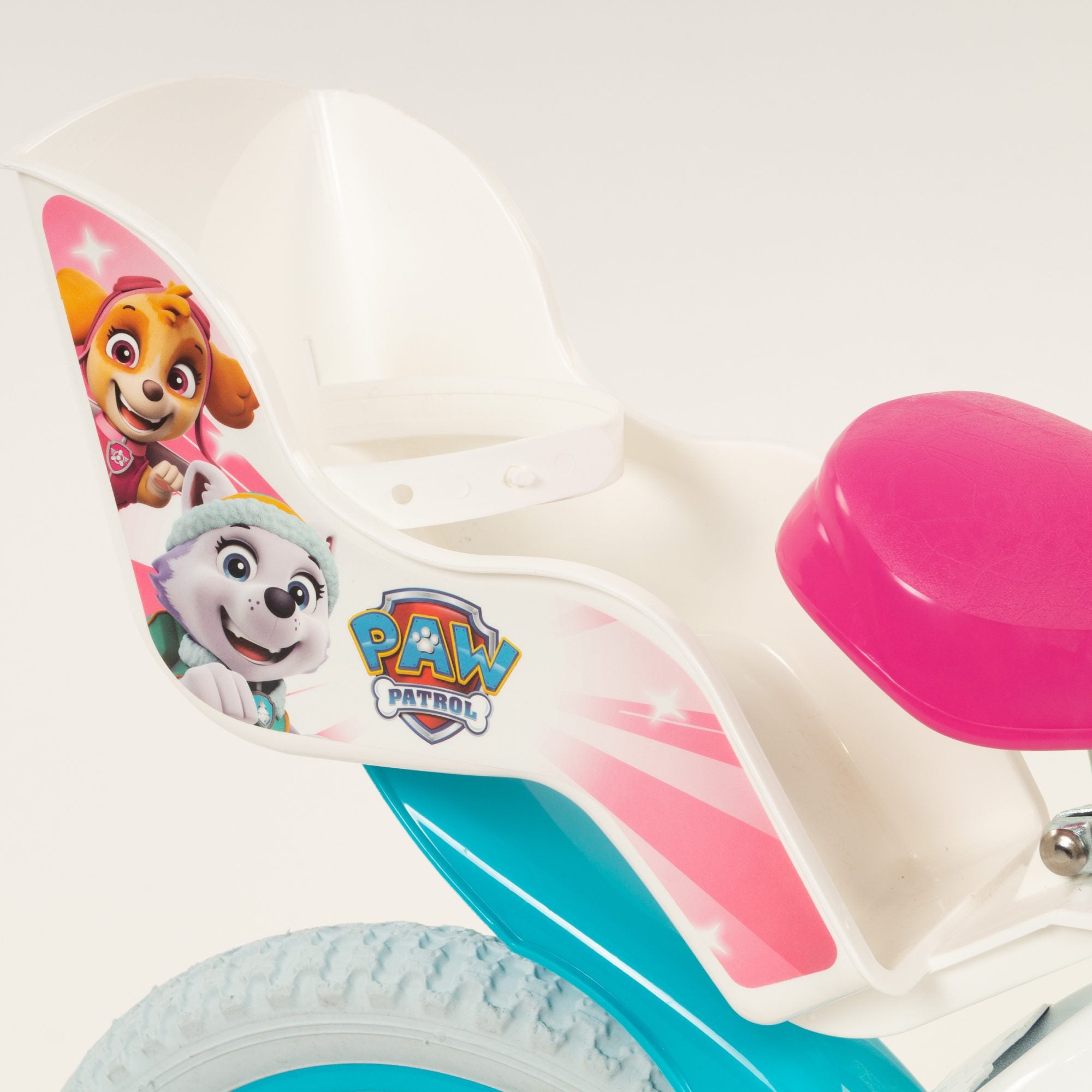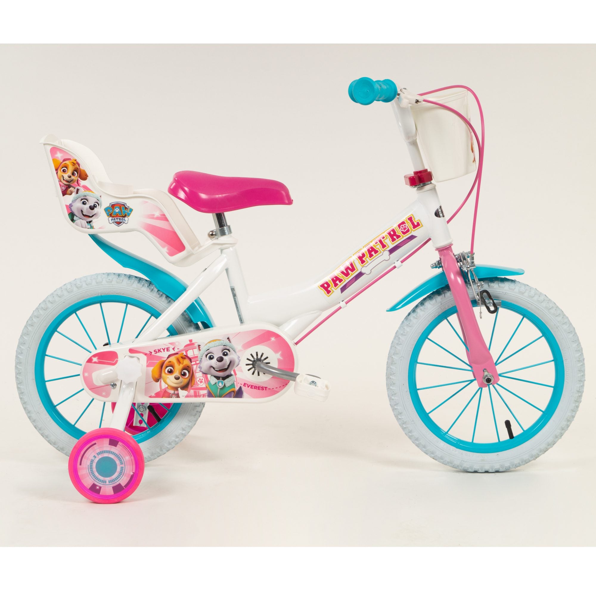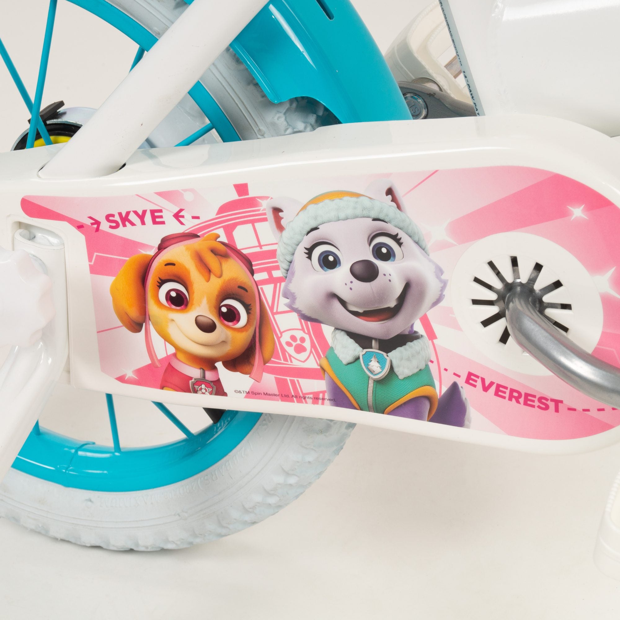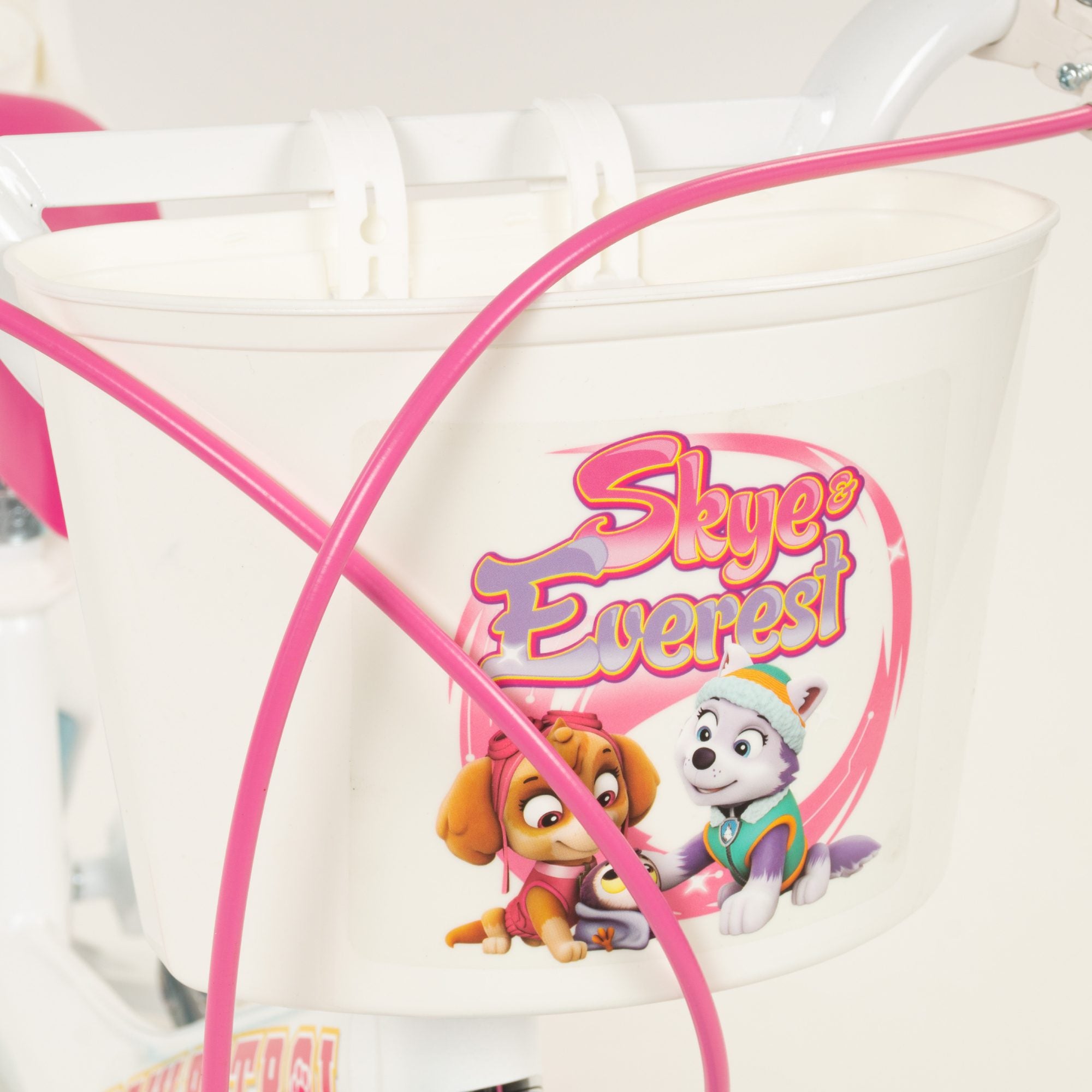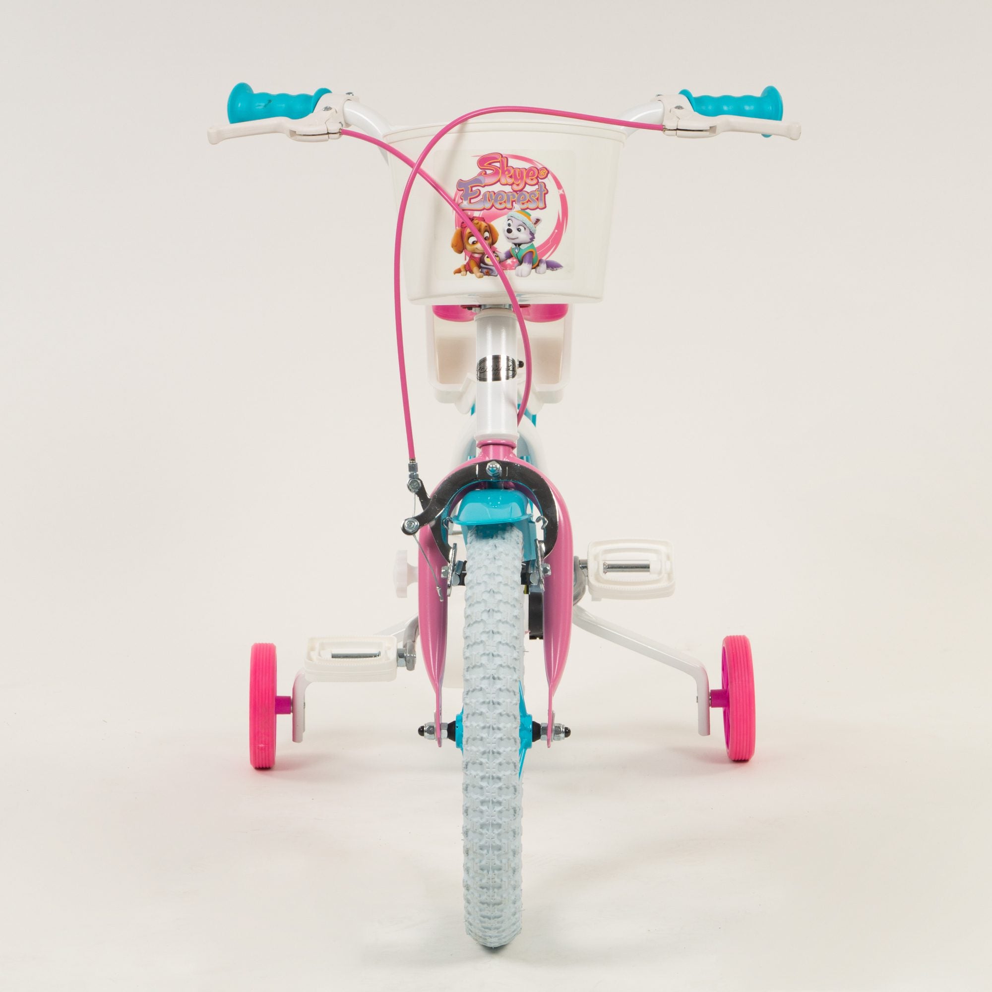 The white Paw Patrol licensed bicycle comes with a fixed rear wheel; so when the pedalling stops, the bikes comes to a halt. It also has a V-type front brake for 12" or a front calliper brake and an additional rear drum brake on the 14" inch bike. The bike features wheels with mudguards and puncture-proof EVA tyres and also comes with removable stabilisers. The Paw Patrol bicycle comes complete with an adjustable saddle and handlebars to accommodate children of all shapes and sizes. Plus a front basket, and colourful Paw Patrol decal. Join Everest and Skye today and save adventure bay!